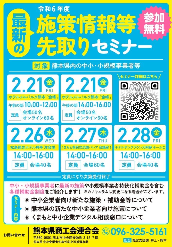 新年度の中小・小規模事業者向け支援策が発表されると予想される時期に、最新の施策や各種補助金制度を紹介することによって、事業者の経営の発展の一助となることを目的として実施します。受講申込みについては、令和7年2月14日(金)です。各自、フォームからお申込みください。
