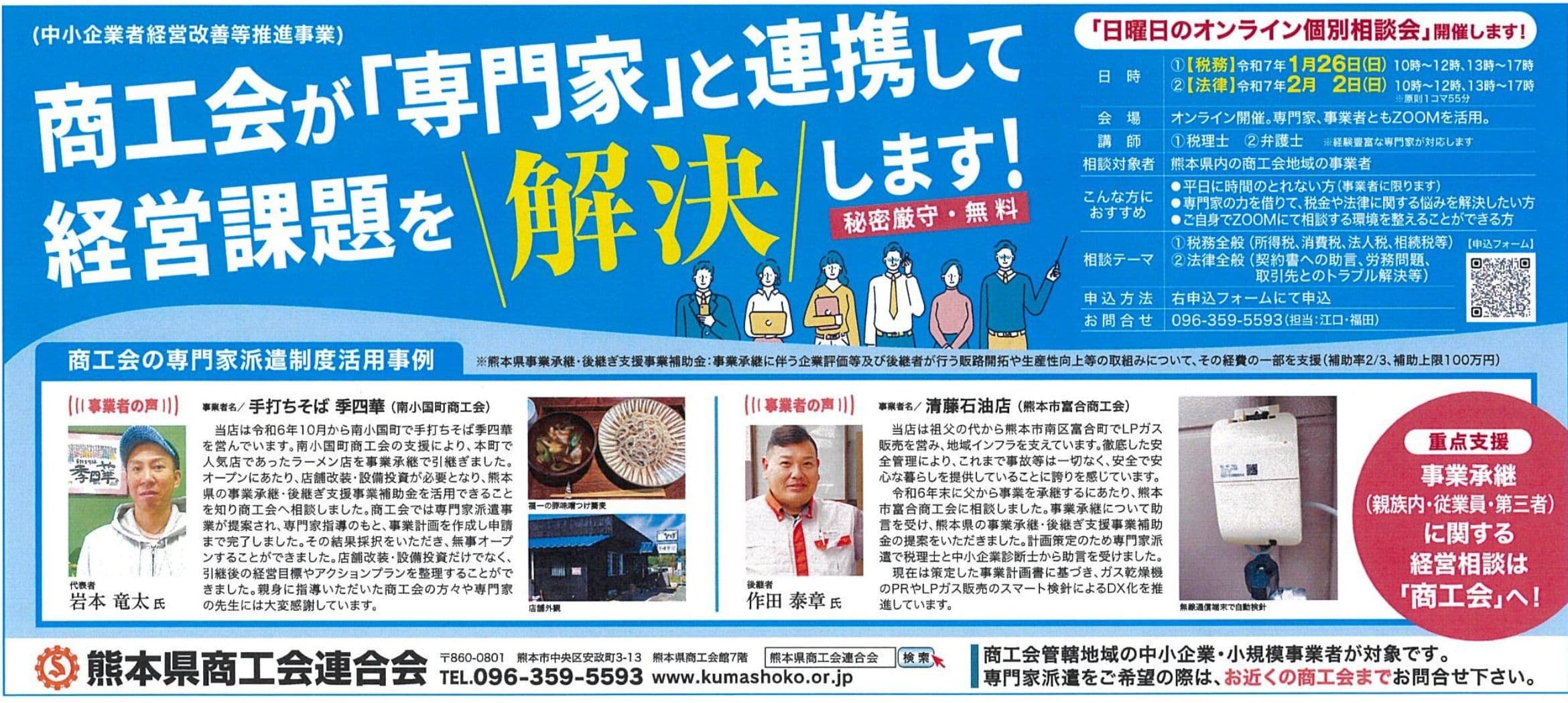 本相談会は、日頃より専門家へ相談を希望するものの、業務上、平日に時間を割くことが難しい事業者を対象として実施するものです。熊本県内の商工会地域の事業者を対象として、熊本県商工会連合会にて実施します。オンラインで参加することできる事業者に対象を絞って開催します。