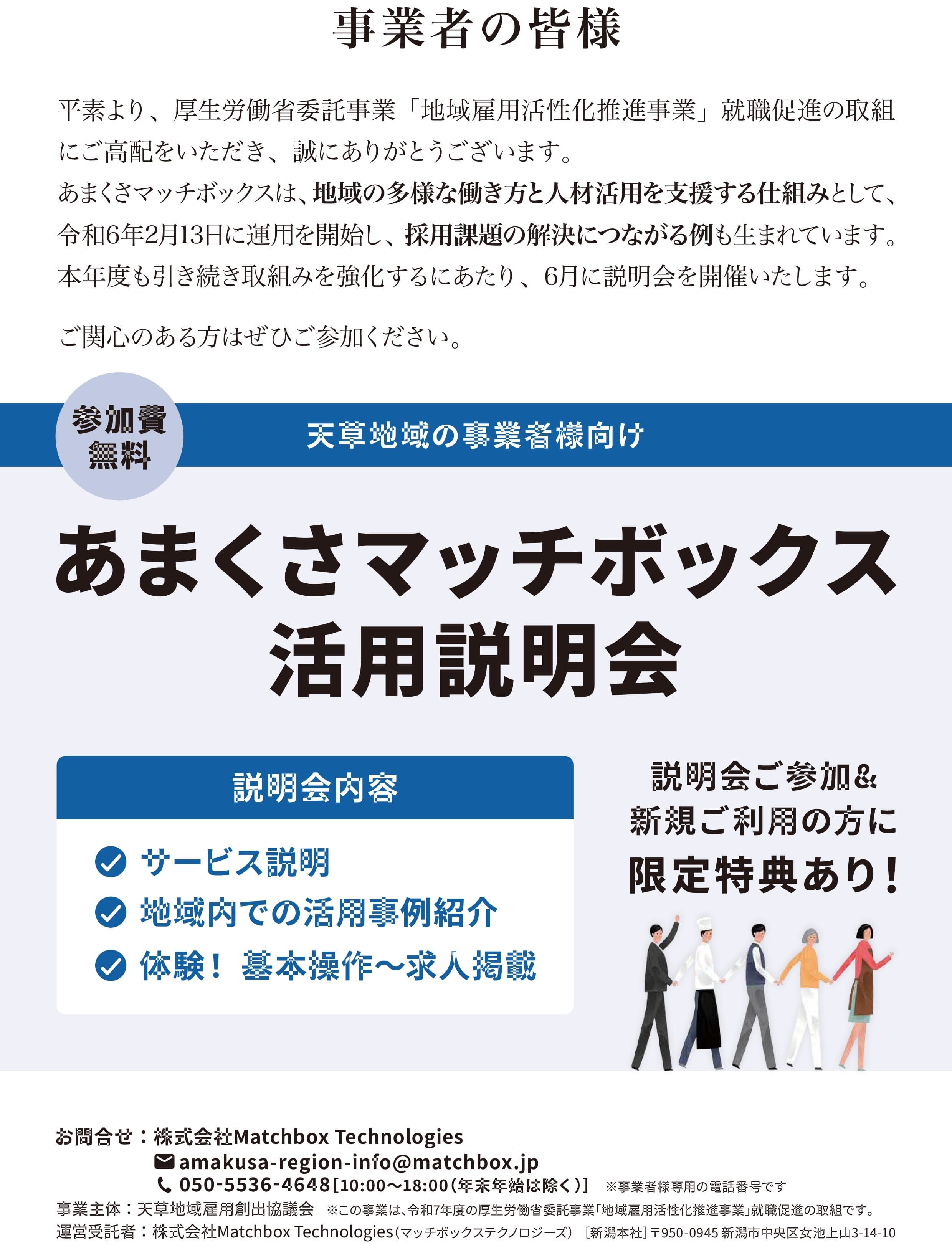 天草地域雇用創出協議会では、厚生労働省「地域雇用活性化推進事業」就職促進の取組のひとつとして、雇用マッチングサイト「あまくさマッチボックス体験就業版」の新規事業者の登録を目的とした説明会を開催いたします。