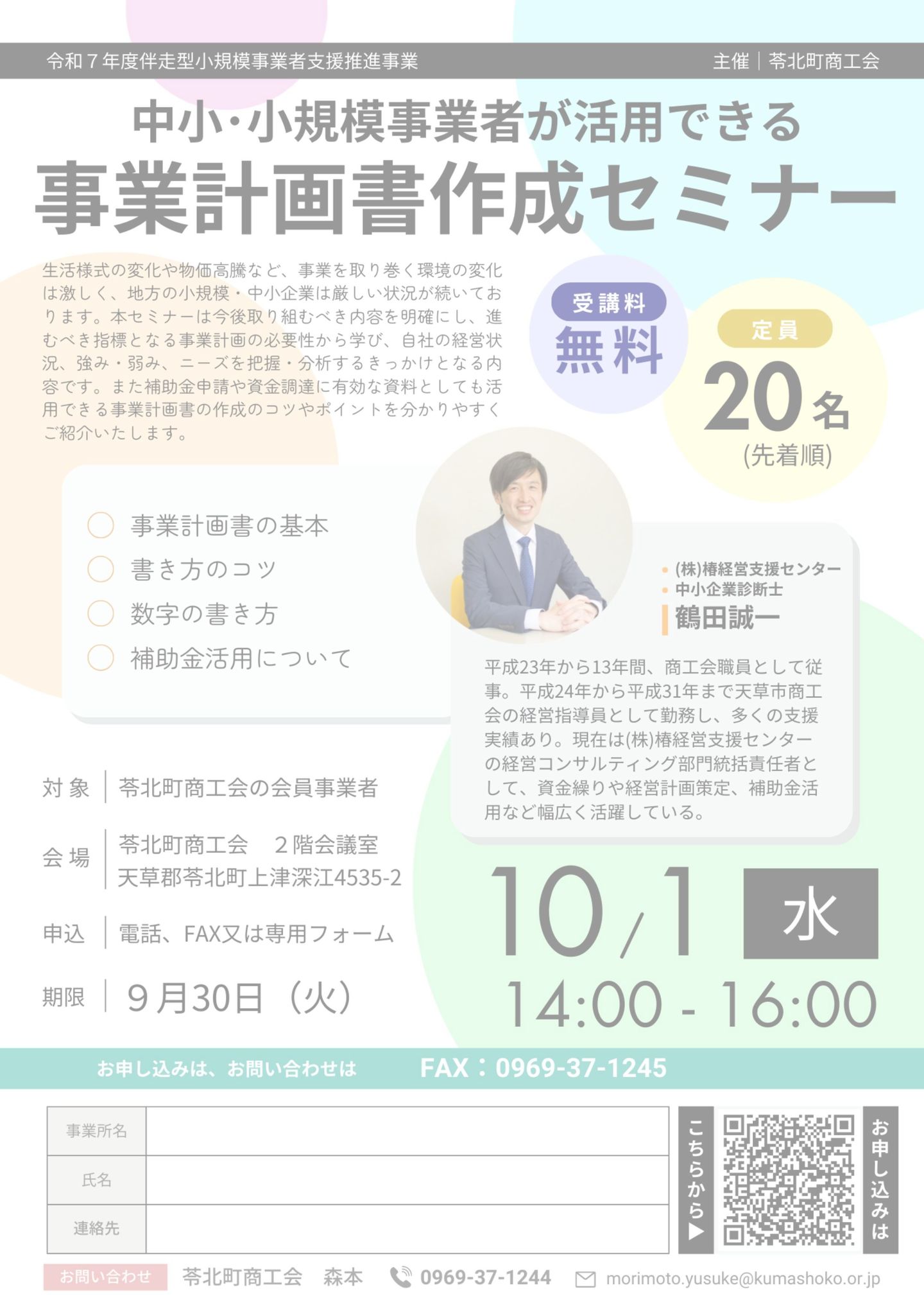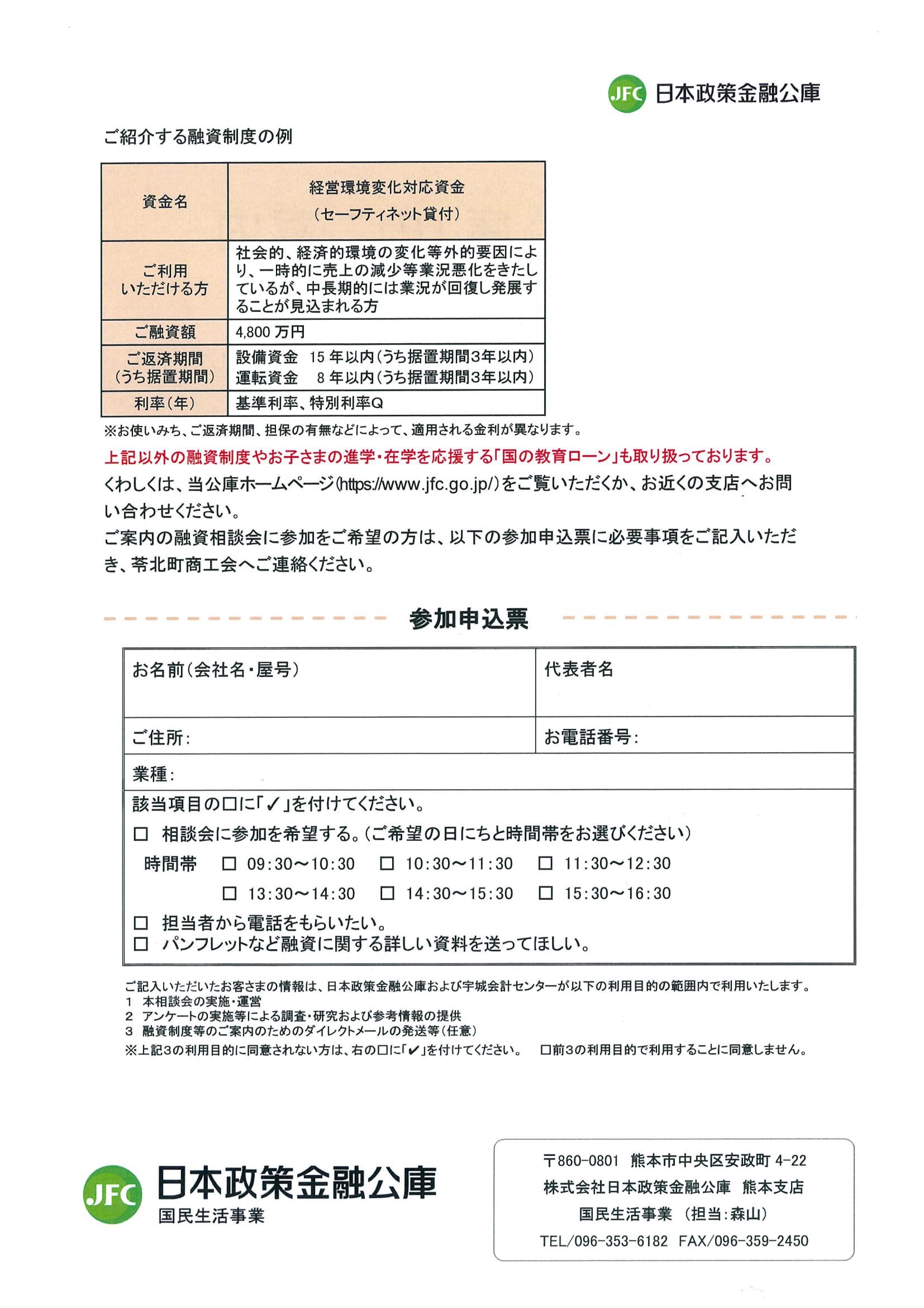 日本政策金融公庫の融資担当者が苓北町商工会に来商し、融資や事業に関するご相談を承ります。参加をご希望の方は、以下の参加申込票に必要事項をご記入いただき、苓北町商工会までご連絡ください。