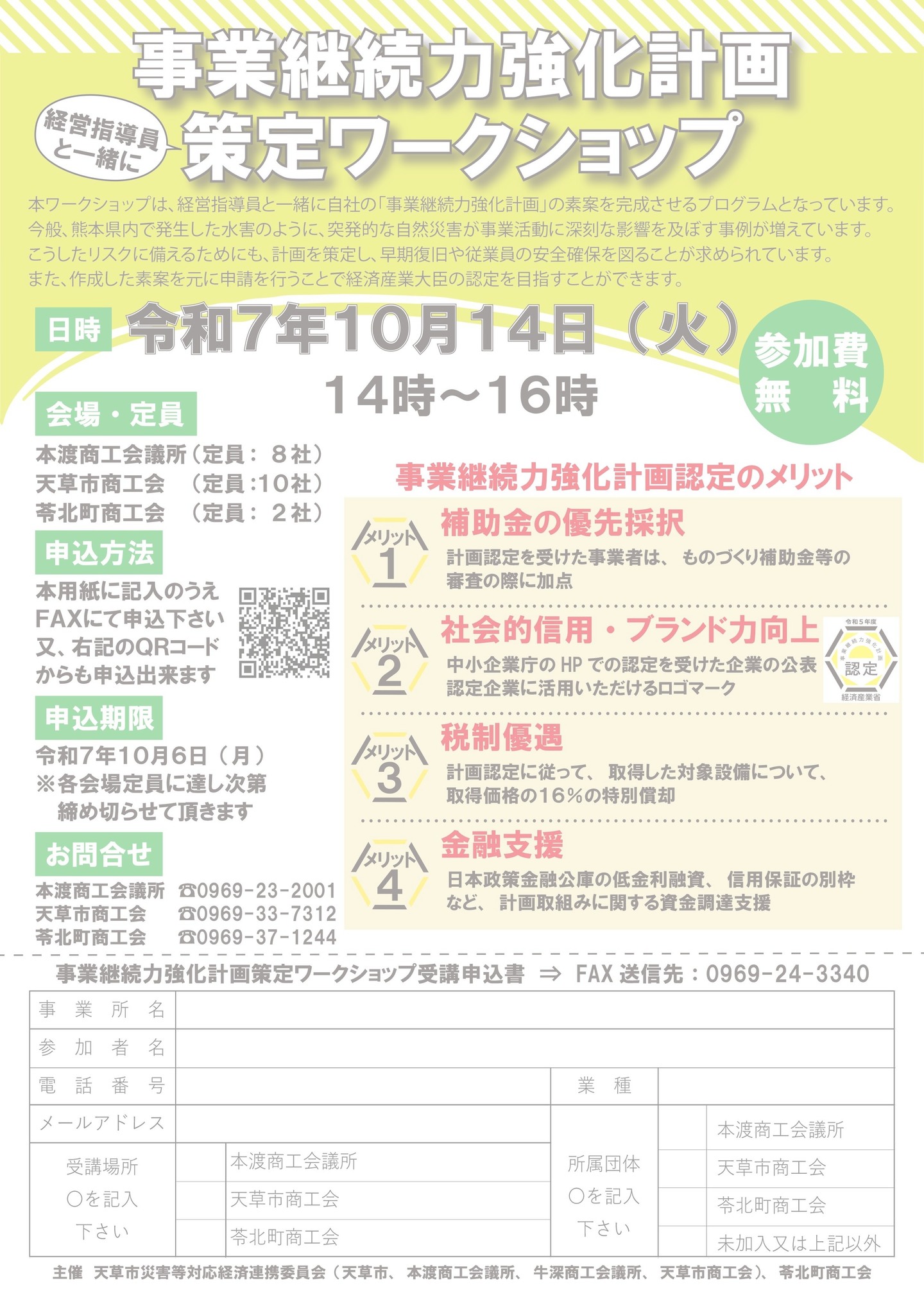 この夏、熊本県内で発生した水害のように、突発的な自然災害が事業の継続に深刻な影響を及ぼす事例が増えています。こうしたリスクに備えるためにも、計画を策定し、早期復旧や従業員の安全確保を図ることが求められています。また、作成した素案を元に申請を行うことで経済産業大臣の認定を目指すことができます。参加ご希望の方は、所属団体へ受講申込書を提出してください。
