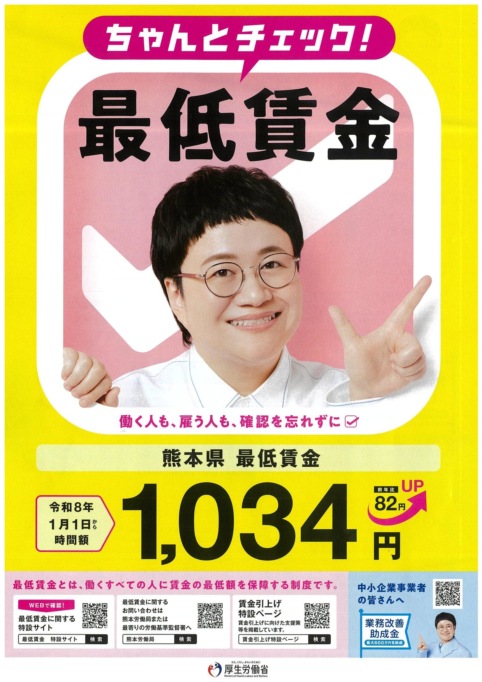 熊本県最低賃金が改正されます。時間額1,034円(令和8年1月1日から) この最低賃金は、県内すべての事業所、労働者に適用されます。
