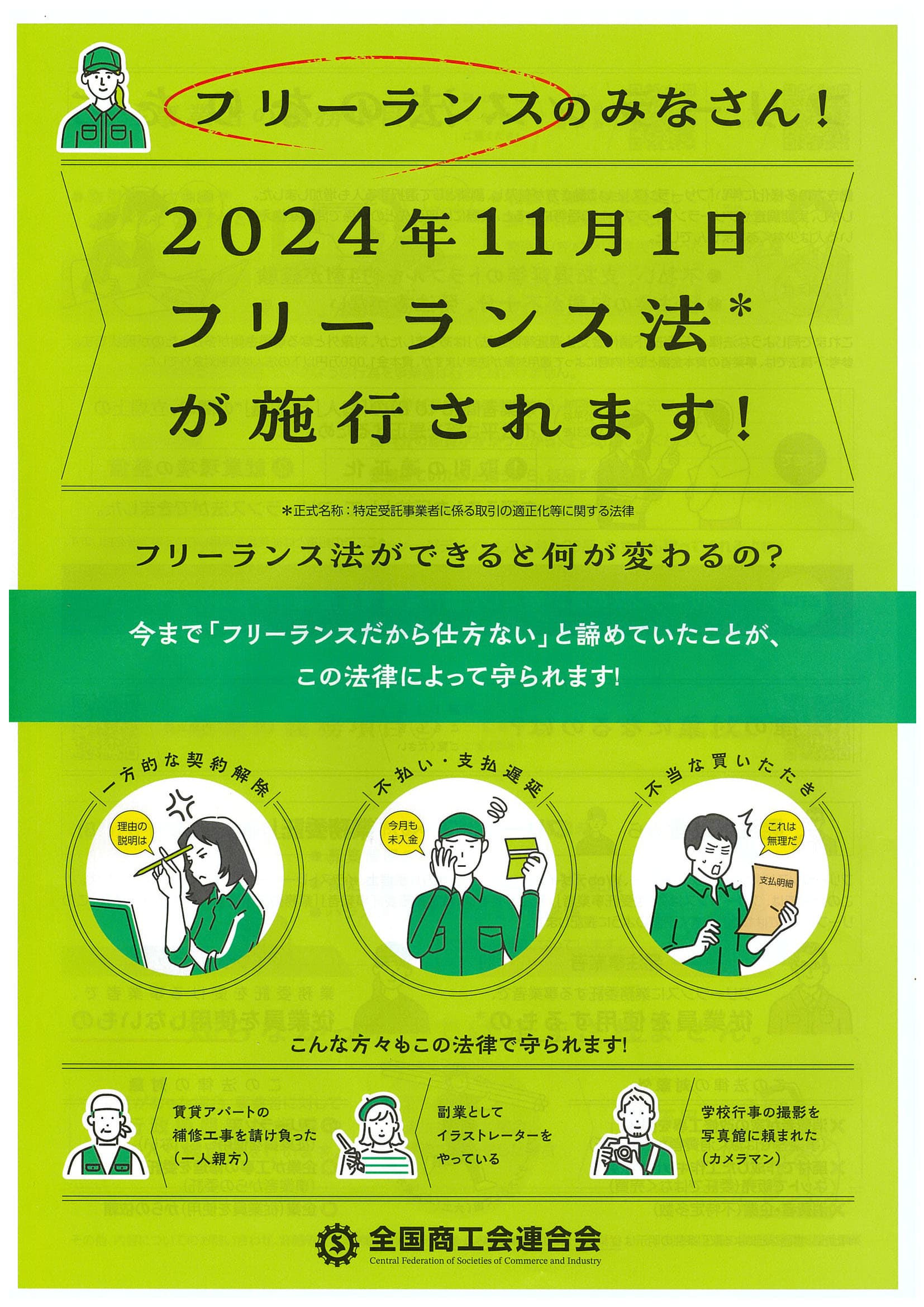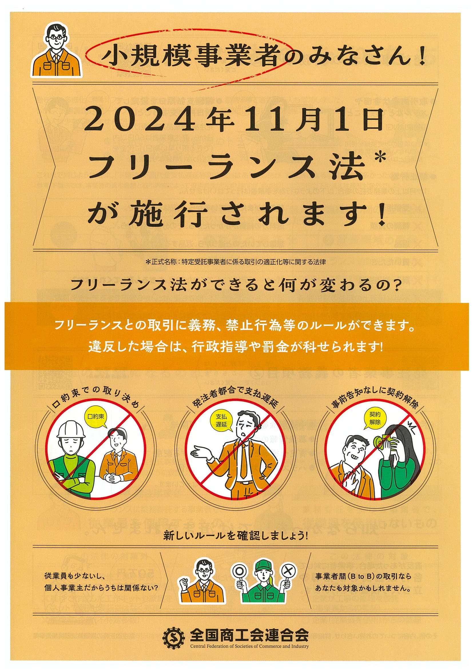 令和6年11月1日に「特定受託事業者に係る取引の適正化等に関する法律(以下「フリーランス・事業者間取引適正化等法」)が施行されます。