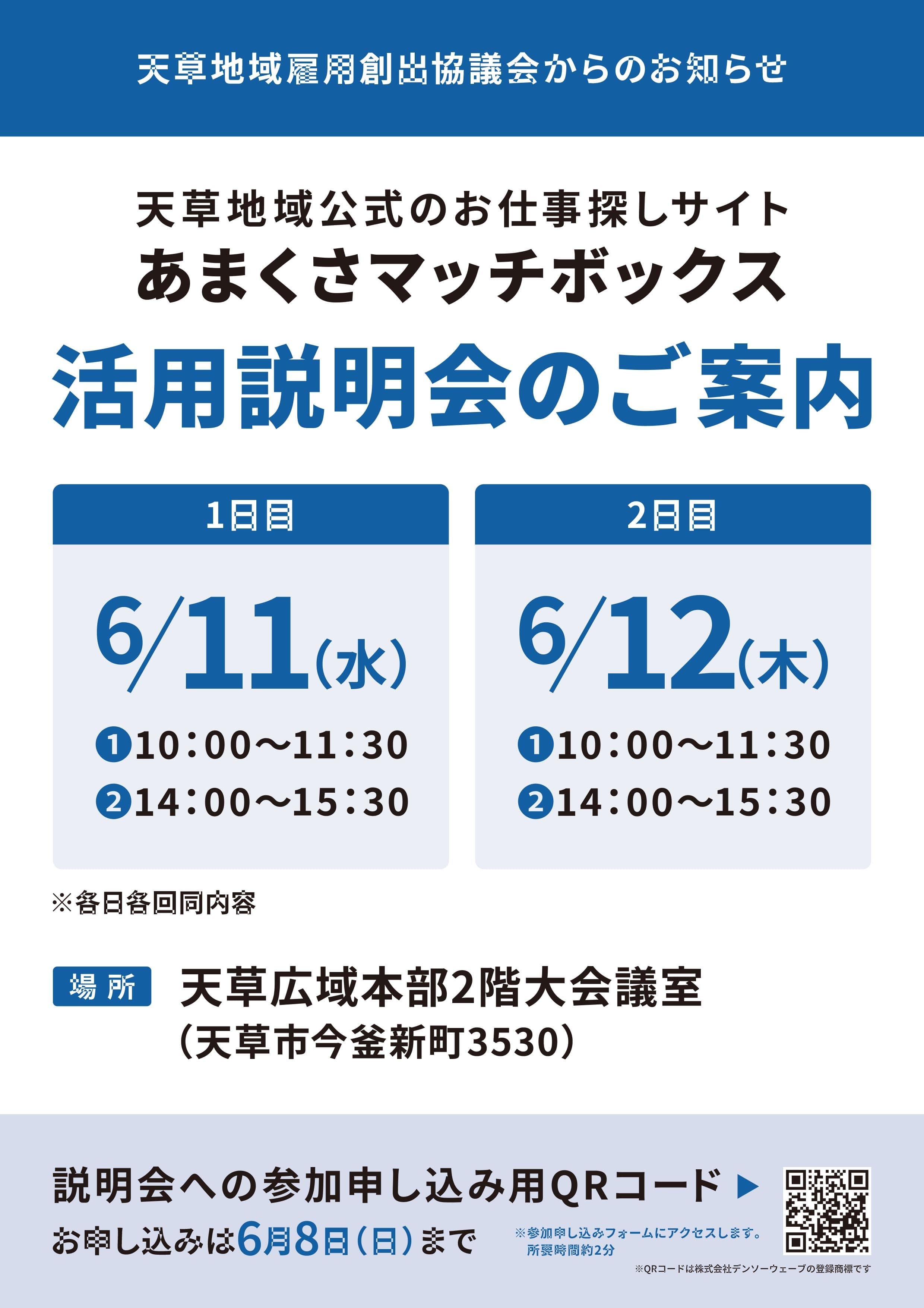 天草地域雇用創出協議会では、厚生労働省「地域雇用活性化推進事業」就職促進の取組のひとつとして、雇用マッチングサイト「あまくさマッチボックス体験就業版」の新規事業者の登録を目的とした説明会を開催いたします。