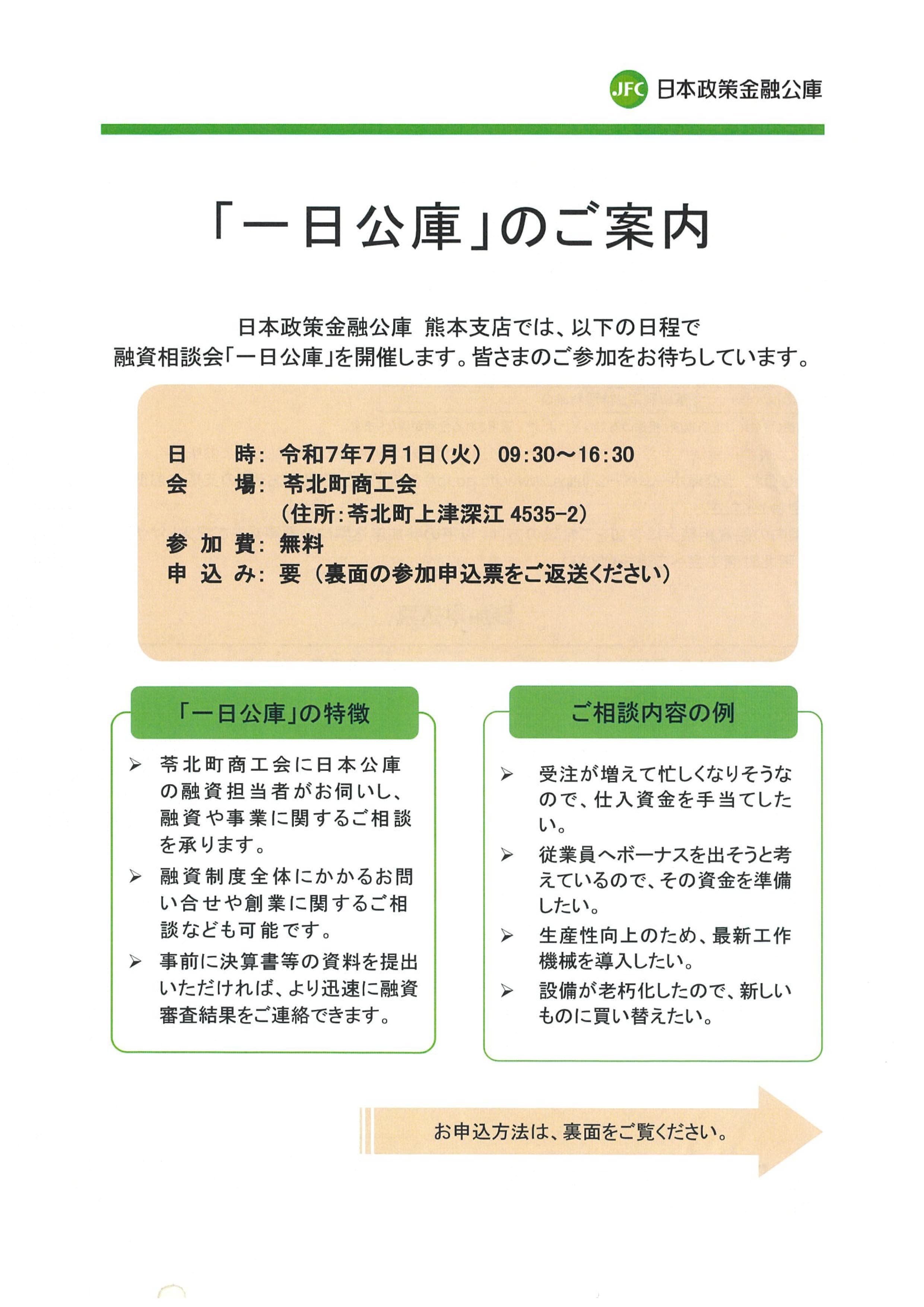 日本政策金融公庫の融資担当者が苓北町商工会に来商し、融資や事業に関するご相談を承ります。参加をご希望の方は、以下の参加申込票に必要事項をご記入いただき、苓北町商工会までご連絡ください。